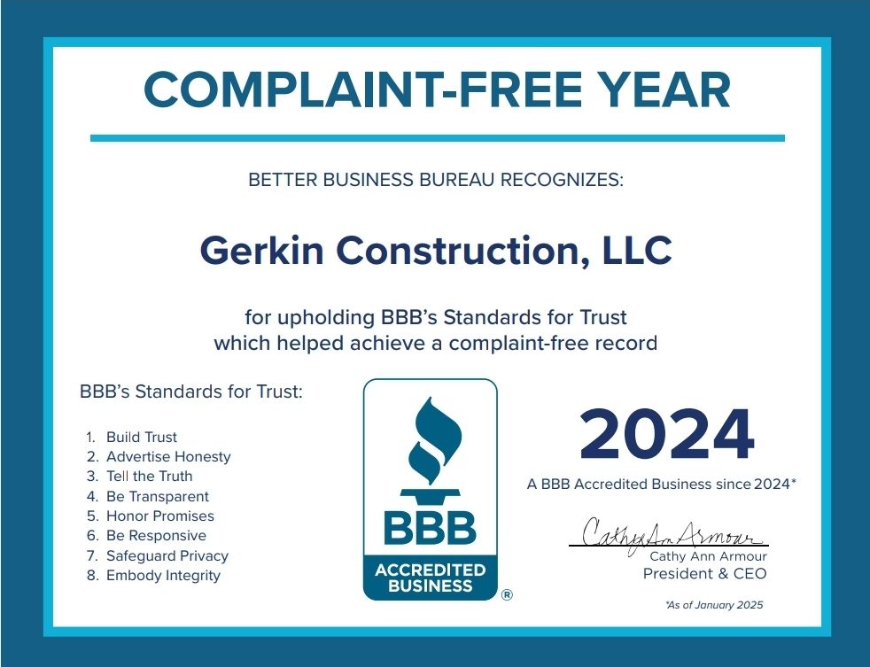 From start to finish, we handle every detail so your home stays beautiful and secure. When you work with Gerkin Construction, you’re choosing trust, quality, and a team that cares about our community.